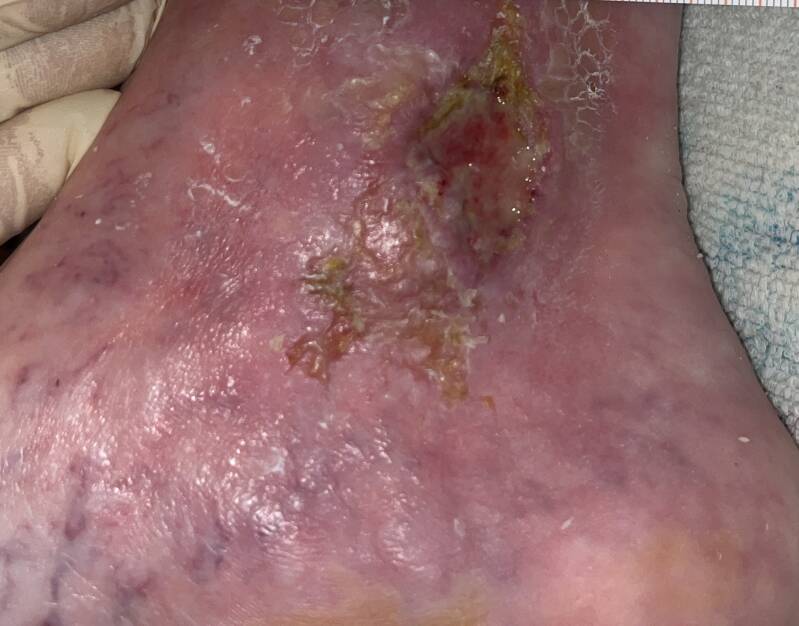 Wundaufnahme, seit längerem bestehendes Ulcus cruris venosum. Ältere Patientin. Guter Ernährungszustand und AZ, Wundschmerzen vorhanden. Unter UV-Licht zeigte sich eine grünliche Verfärbung, was auf Pseudomonas hinwies. Fußpulse palpabel. Wundrand keratös. Als Behandlung entschied ich mich für Hydroclean um die Wunde zu reinigen. Dies wurde nur mit einer semipermeablen Wundfolie fixiert. Der Verbandswechsel erfolgte alle 2 Tage.